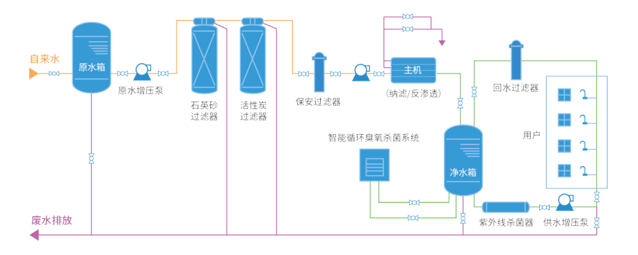 直饮水处理站和净水设备广泛应用于工厂、办公楼、学校、商业区等多种场所。根据不同的水源和需求,通常包括多重水质净化工艺,如纳滤、反渗透、臭氧、紫外线双重自动化杀菌等,能够有效去除水中的细菌、病毒、有害物质及重金属,确保水质达到CJ94《饮用净水水质标准》。并配备智能监控系统,实时监测水质变化及设备状态,保障设备持续稳定运行。